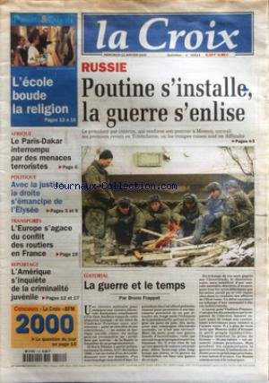 CROIX (LA) [No 35514] du 12/01/2000 - RUSSIE/ POUTINE S'INSTALLE - LA GUERRE S'ENLISE - LA GUERRE ET LE TEMPS PAR FRAPPAT - L'AMERIQUE S'INQUIETE DE LA CRIMINALITE JUVENILE - L'EUROPE S'AGACE DU CONFLIT DES ROUTIERS EN FRANCE - AVEC LA JUSTICE - LA DROITE S'EMANCIPE DE L'ELYSEE - LE PARIS-DAKAR INTERROMPU PAR DES MENACES TERRORISTES - L'ECOLE BOUDE LA RELIGION documentation complète en ligne gratuitement. Lecture